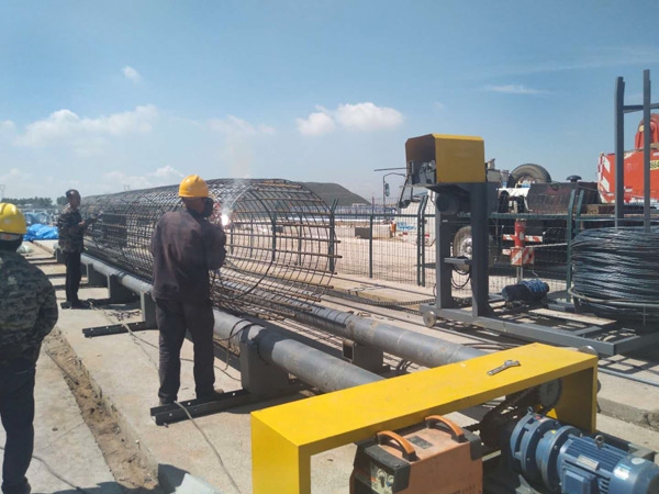 2、鋼筋籠12米以上,或者單節(jié)鋼筋籠較重時(shí),骨架中間加焊1、2圈纏繞筋替代第三個(gè)過渡箍?;蛑苯又虚g開始繞筋,另半截籠前面向中間纏繞連接完成。所以三個(gè)過渡箍的中間一個(gè)箍應(yīng)置放在中間靠后面的地方,借以減少?zèng)_擊振動(dòng)。退出輥輪并過渡到后面輥輪的方法--將過渡箍向后面推壓,讓過渡箍順膠輥旋轉(zhuǎn)到上面直到全部退出。準(zhǔn)備臺(tái)架;若采用骨架直接滾進(jìn)輥輪內(nèi)檔(小型鋼筋籠),骨架制作臺(tái)架高度與設(shè)備同高。